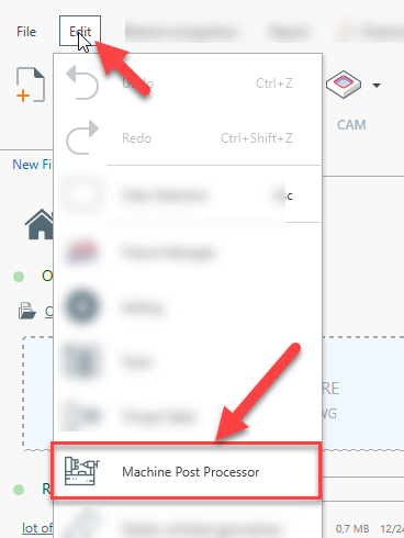 From Main Menu -> Edit -> Machine Post Processor to open the post processor dialog screen.