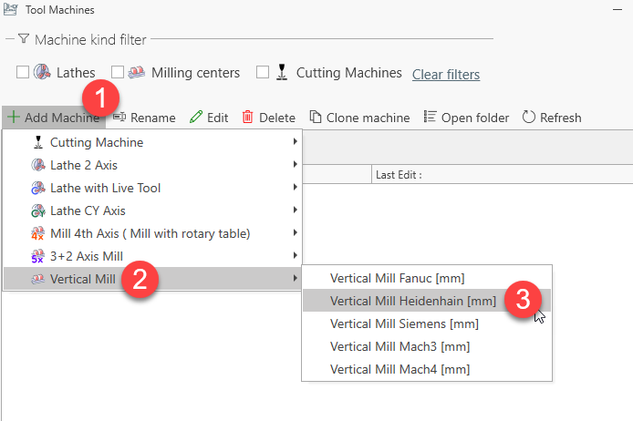 To add a new vertical mill machine : [Add Machine] -> [Vertical Mill] -> Select the preferred machine kind.